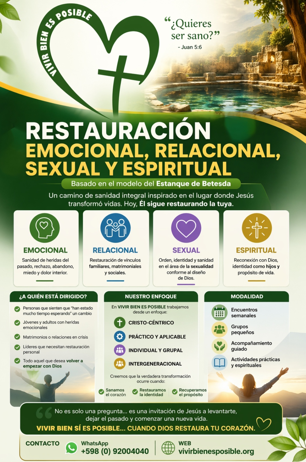Es un programa de apoyo dentro del Ministerio "Vivir Bien es Posible" que está enfocado en la sanidad y restauración de las personas con problemas emocionales, relacionales y/o sexuales. Cada charla brindada es Cristo céntrica se hace referencia a la historia bíblica de Juan 5 donde Jesús sana un paralítico como forma de la sanidad y restauración que Dios ofrece. El estanque simboliza la esperanza de encontrar sanidad y de la necesidad de fe y paciencia.